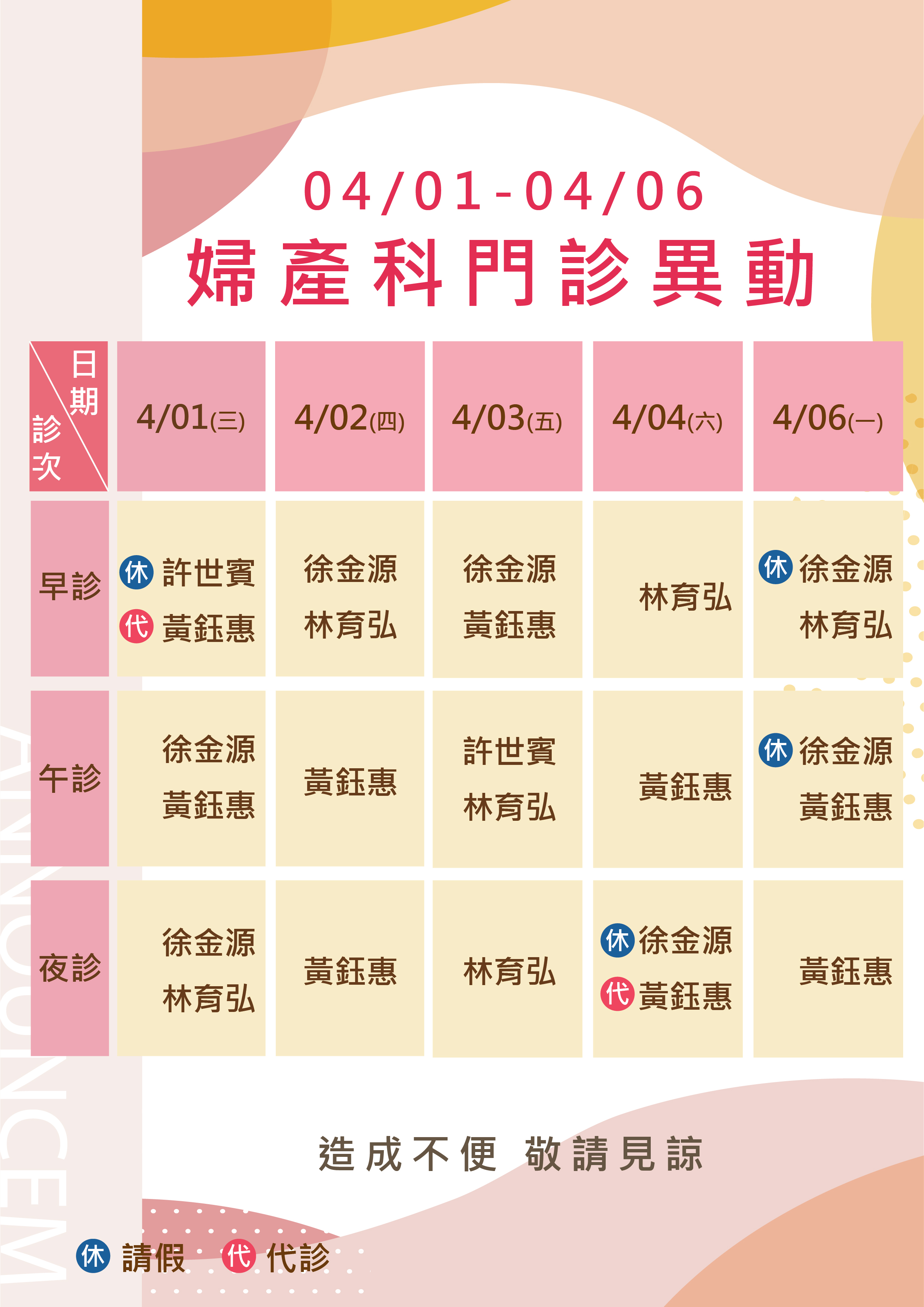 4/1-4/6婦科門診異動