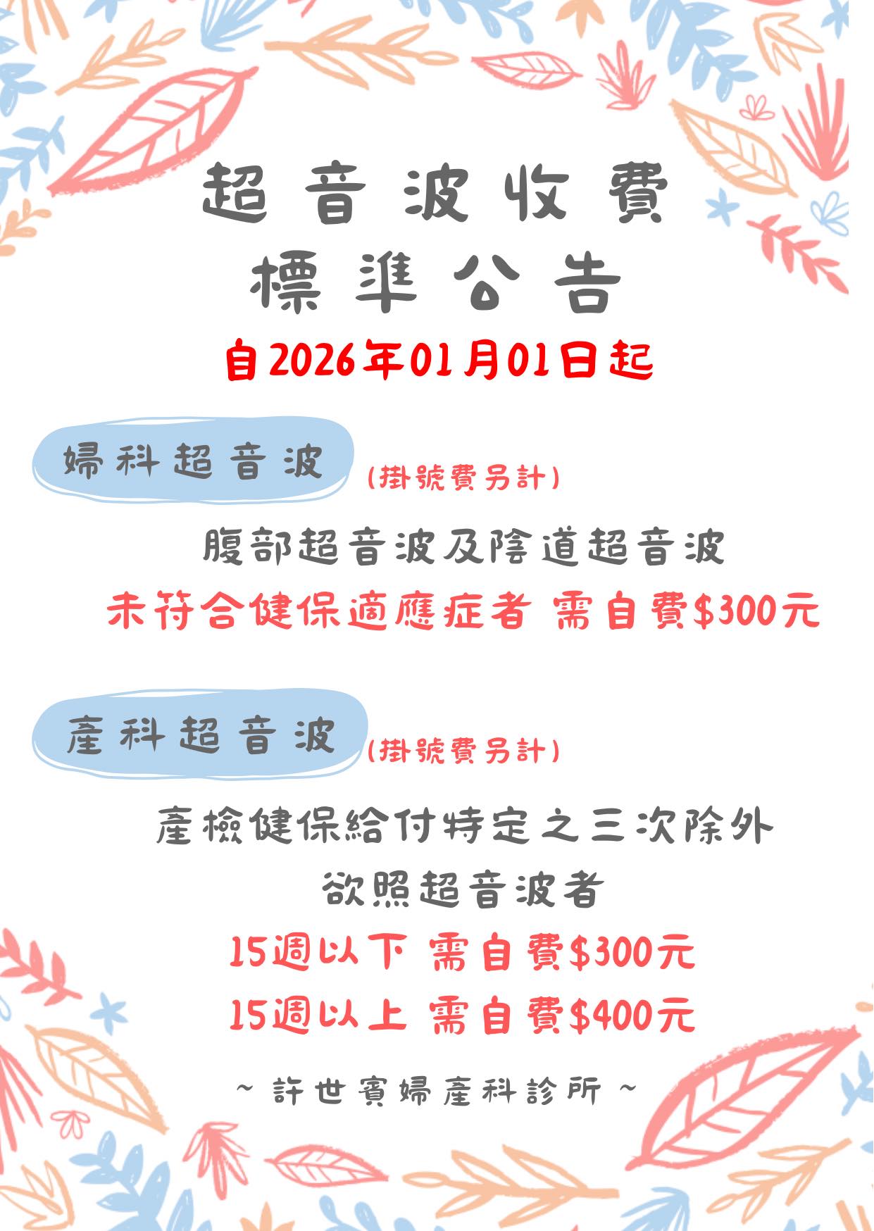 一般婦科若未符合健保適應症者如有照腹部或陰道超音波之需求,需自費$300元