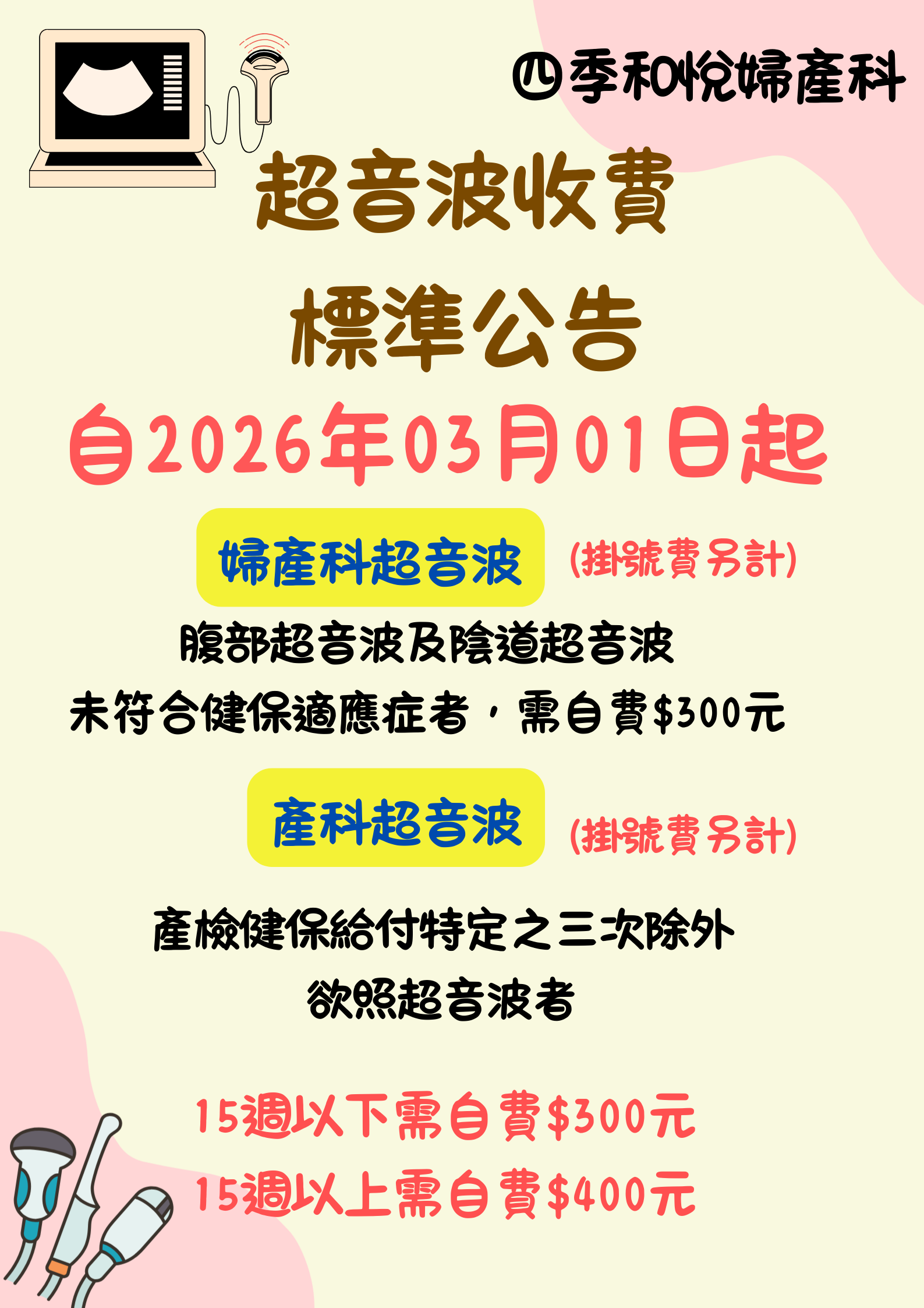 一般婦科若未符合健保適應症者如有照腹部或陰道超音波之需求,需自費$300元